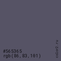 Цвет #565365 в цветовой модели RGB обозначается тремя октетами (86, 83, 101) в десятичном формате и #565365 в шестнадцатиричном (hex) формате, которые являются интенсивностью красного 86 (hex 56), интенсивность зелёного 83 (hex 53) и интенсивность синего 101 (hex 65).