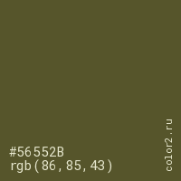 Цвет #56552B в цветовой модели RGB обозначается тремя октетами (86, 85, 43) в десятичном формате и #56552B в шестнадцатиричном (hex) формате, которые являются интенсивностью красного 86 (hex 56), интенсивность зелёного 85 (hex 55) и интенсивность синего 43 (hex 2B).