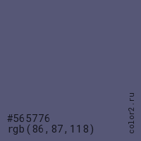 Цвет #565776 в цветовой модели RGB обозначается тремя октетами (86, 87, 118) в десятичном формате и #565776 в шестнадцатиричном (hex) формате, которые являются интенсивностью красного 86 (hex 56), интенсивность зелёного 87 (hex 57) и интенсивность синего 118 (hex 76).