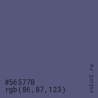 Цвет #56577B в цветовой модели RGB обозначается тремя октетами (86, 87, 123) в десятичном формате и #56577B в шестнадцатиричном (hex) формате, которые являются интенсивностью красного 86 (hex 56), интенсивность зелёного 87 (hex 57) и интенсивность синего 123 (hex 7B).