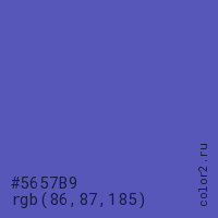 Цвет #5657B9 в цветовой модели RGB обозначается тремя октетами (86, 87, 185) в десятичном формате и #5657B9 в шестнадцатиричном (hex) формате, которые являются интенсивностью красного 86 (hex 56), интенсивность зелёного 87 (hex 57) и интенсивность синего 185 (hex B9).