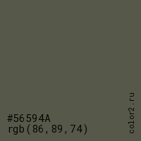 Цвет #56594A в цветовой модели RGB обозначается тремя октетами (86, 89, 74) в десятичном формате и #56594A в шестнадцатиричном (hex) формате, которые являются интенсивностью красного 86 (hex 56), интенсивность зелёного 89 (hex 59) и интенсивность синего 74 (hex 4A).