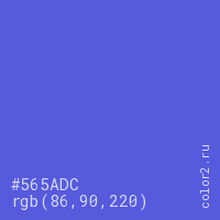 Цвет #565ADC в цветовой модели RGB обозначается тремя октетами (86, 90, 220) в десятичном формате и #565ADC в шестнадцатиричном (hex) формате, которые являются интенсивностью красного 86 (hex 56), интенсивность зелёного 90 (hex 5A) и интенсивность синего 220 (hex DC).