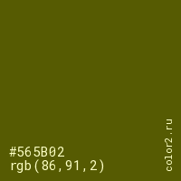 Цвет #565B02 в цветовой модели RGB обозначается тремя октетами (86, 91, 2) в десятичном формате и #565B02 в шестнадцатиричном (hex) формате, которые являются интенсивностью красного 86 (hex 56), интенсивность зелёного 91 (hex 5B) и интенсивность синего 2 (hex 02).