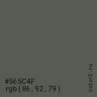 Цвет #565C4F в цветовой модели RGB обозначается тремя октетами (86, 92, 79) в десятичном формате и #565C4F в шестнадцатиричном (hex) формате, которые являются интенсивностью красного 86 (hex 56), интенсивность зелёного 92 (hex 5C) и интенсивность синего 79 (hex 4F).
