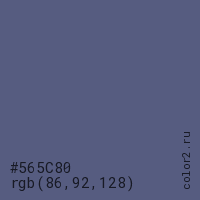Цвет #565C80 в цветовой модели RGB обозначается тремя октетами (86, 92, 128) в десятичном формате и #565C80 в шестнадцатиричном (hex) формате, которые являются интенсивностью красного 86 (hex 56), интенсивность зелёного 92 (hex 5C) и интенсивность синего 128 (hex 80).