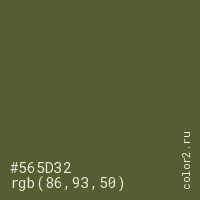 Цвет #565D32 в цветовой модели RGB обозначается тремя октетами (86, 93, 50) в десятичном формате и #565D32 в шестнадцатиричном (hex) формате, которые являются интенсивностью красного 86 (hex 56), интенсивность зелёного 93 (hex 5D) и интенсивность синего 50 (hex 32).