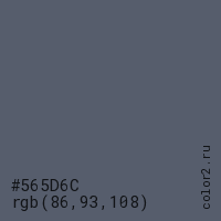 Цвет #565D6C в цветовой модели RGB обозначается тремя октетами (86, 93, 108) в десятичном формате и #565D6C в шестнадцатиричном (hex) формате, которые являются интенсивностью красного 86 (hex 56), интенсивность зелёного 93 (hex 5D) и интенсивность синего 108 (hex 6C).