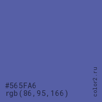 Цвет #565FA6 в цветовой модели RGB обозначается тремя октетами (86, 95, 166) в десятичном формате и #565FA6 в шестнадцатиричном (hex) формате, которые являются интенсивностью красного 86 (hex 56), интенсивность зелёного 95 (hex 5F) и интенсивность синего 166 (hex A6).