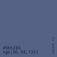 Цвет #566285 в цветовой модели RGB обозначается тремя октетами (86, 98, 133) в десятичном формате и #566285 в шестнадцатиричном (hex) формате, которые являются интенсивностью красного 86 (hex 56), интенсивность зелёного 98 (hex 62) и интенсивность синего 133 (hex 85).