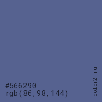 Цвет #566290 в цветовой модели RGB обозначается тремя октетами (86, 98, 144) в десятичном формате и #566290 в шестнадцатиричном (hex) формате, которые являются интенсивностью красного 86 (hex 56), интенсивность зелёного 98 (hex 62) и интенсивность синего 144 (hex 90).
