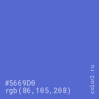 Цвет #5669D0 в цветовой модели RGB обозначается тремя октетами (86, 105, 208) в десятичном формате и #5669D0 в шестнадцатиричном (hex) формате, которые являются интенсивностью красного 86 (hex 56), интенсивность зелёного 105 (hex 69) и интенсивность синего 208 (hex D0).