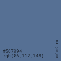 Цвет #567094 в цветовой модели RGB обозначается тремя октетами (86, 112, 148) в десятичном формате и #567094 в шестнадцатиричном (hex) формате, которые являются интенсивностью красного 86 (hex 56), интенсивность зелёного 112 (hex 70) и интенсивность синего 148 (hex 94).