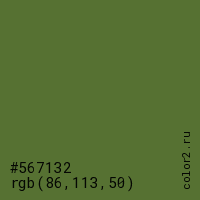 Цвет #567132 в цветовой модели RGB обозначается тремя октетами (86, 113, 50) в десятичном формате и #567132 в шестнадцатиричном (hex) формате, которые являются интенсивностью красного 86 (hex 56), интенсивность зелёного 113 (hex 71) и интенсивность синего 50 (hex 32).