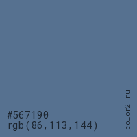 Цвет #567190 в цветовой модели RGB обозначается тремя октетами (86, 113, 144) в десятичном формате и #567190 в шестнадцатиричном (hex) формате, которые являются интенсивностью красного 86 (hex 56), интенсивность зелёного 113 (hex 71) и интенсивность синего 144 (hex 90).