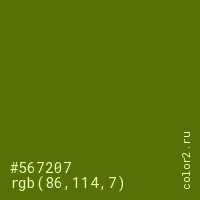 Цвет #567207 в цветовой модели RGB обозначается тремя октетами (86, 114, 7) в десятичном формате и #567207 в шестнадцатиричном (hex) формате, которые являются интенсивностью красного 86 (hex 56), интенсивность зелёного 114 (hex 72) и интенсивность синего 7 (hex 07).