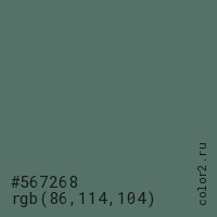 Цвет #567268 в цветовой модели RGB обозначается тремя октетами (86, 114, 104) в десятичном формате и #567268 в шестнадцатиричном (hex) формате, которые являются интенсивностью красного 86 (hex 56), интенсивность зелёного 114 (hex 72) и интенсивность синего 104 (hex 68).