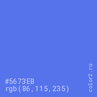 Цвет #5673EB в цветовой модели RGB обозначается тремя октетами (86, 115, 235) в десятичном формате и #5673EB в шестнадцатиричном (hex) формате, которые являются интенсивностью красного 86 (hex 56), интенсивность зелёного 115 (hex 73) и интенсивность синего 235 (hex EB).