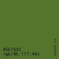 Цвет #56752C в цветовой модели RGB обозначается тремя октетами (86, 117, 44) в десятичном формате и #56752C в шестнадцатиричном (hex) формате, которые являются интенсивностью красного 86 (hex 56), интенсивность зелёного 117 (hex 75) и интенсивность синего 44 (hex 2C).