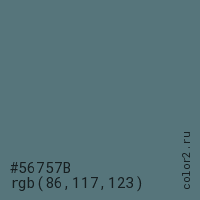 Цвет #56757B в цветовой модели RGB обозначается тремя октетами (86, 117, 123) в десятичном формате и #56757B в шестнадцатиричном (hex) формате, которые являются интенсивностью красного 86 (hex 56), интенсивность зелёного 117 (hex 75) и интенсивность синего 123 (hex 7B).