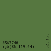Цвет #567740 в цветовой модели RGB обозначается тремя октетами (86, 119, 64) в десятичном формате и #567740 в шестнадцатиричном (hex) формате, которые являются интенсивностью красного 86 (hex 56), интенсивность зелёного 119 (hex 77) и интенсивность синего 64 (hex 40).