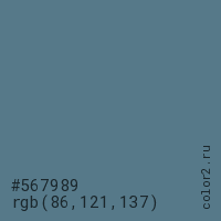 Цвет #567989 в цветовой модели RGB обозначается тремя октетами (86, 121, 137) в десятичном формате и #567989 в шестнадцатиричном (hex) формате, которые являются интенсивностью красного 86 (hex 56), интенсивность зелёного 121 (hex 79) и интенсивность синего 137 (hex 89).