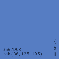 Цвет #567DC3 в цветовой модели RGB обозначается тремя октетами (86, 125, 195) в десятичном формате и #567DC3 в шестнадцатиричном (hex) формате, которые являются интенсивностью красного 86 (hex 56), интенсивность зелёного 125 (hex 7D) и интенсивность синего 195 (hex C3).