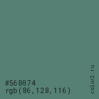 Цвет #568074 в цветовой модели RGB обозначается тремя октетами (86, 128, 116) в десятичном формате и #568074 в шестнадцатиричном (hex) формате, которые являются интенсивностью красного 86 (hex 56), интенсивность зелёного 128 (hex 80) и интенсивность синего 116 (hex 74).