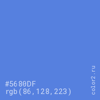 Цвет #5680DF в цветовой модели RGB обозначается тремя октетами (86, 128, 223) в десятичном формате и #5680DF в шестнадцатиричном (hex) формате, которые являются интенсивностью красного 86 (hex 56), интенсивность зелёного 128 (hex 80) и интенсивность синего 223 (hex DF).