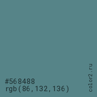 Цвет #568488 в цветовой модели RGB обозначается тремя октетами (86, 132, 136) в десятичном формате и #568488 в шестнадцатиричном (hex) формате, которые являются интенсивностью красного 86 (hex 56), интенсивность зелёного 132 (hex 84) и интенсивность синего 136 (hex 88).