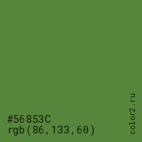 Цвет #56853C в цветовой модели RGB обозначается тремя октетами (86, 133, 60) в десятичном формате и #56853C в шестнадцатиричном (hex) формате, которые являются интенсивностью красного 86 (hex 56), интенсивность зелёного 133 (hex 85) и интенсивность синего 60 (hex 3C).