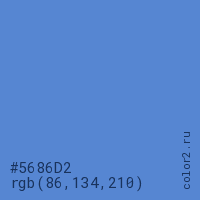 Цвет #5686D2 в цветовой модели RGB обозначается тремя октетами (86, 134, 210) в десятичном формате и #5686D2 в шестнадцатиричном (hex) формате, которые являются интенсивностью красного 86 (hex 56), интенсивность зелёного 134 (hex 86) и интенсивность синего 210 (hex D2).