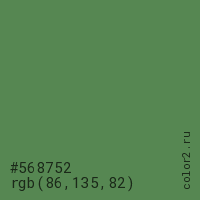 Цвет #568752 в цветовой модели RGB обозначается тремя октетами (86, 135, 82) в десятичном формате и #568752 в шестнадцатиричном (hex) формате, которые являются интенсивностью красного 86 (hex 56), интенсивность зелёного 135 (hex 87) и интенсивность синего 82 (hex 52).