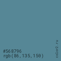 Цвет #568796 в цветовой модели RGB обозначается тремя октетами (86, 135, 150) в десятичном формате и #568796 в шестнадцатиричном (hex) формате, которые являются интенсивностью красного 86 (hex 56), интенсивность зелёного 135 (hex 87) и интенсивность синего 150 (hex 96).