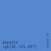 Цвет #5687CF в цветовой модели RGB обозначается тремя октетами (86, 135, 207) в десятичном формате и #5687CF в шестнадцатиричном (hex) формате, которые являются интенсивностью красного 86 (hex 56), интенсивность зелёного 135 (hex 87) и интенсивность синего 207 (hex CF).