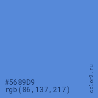 Цвет #5689D9 в цветовой модели RGB обозначается тремя октетами (86, 137, 217) в десятичном формате и #5689D9 в шестнадцатиричном (hex) формате, которые являются интенсивностью красного 86 (hex 56), интенсивность зелёного 137 (hex 89) и интенсивность синего 217 (hex D9).