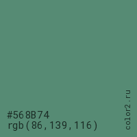 Цвет #568B74 в цветовой модели RGB обозначается тремя октетами (86, 139, 116) в десятичном формате и #568B74 в шестнадцатиричном (hex) формате, которые являются интенсивностью красного 86 (hex 56), интенсивность зелёного 139 (hex 8B) и интенсивность синего 116 (hex 74).