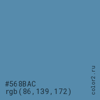 Цвет #568BAC в цветовой модели RGB обозначается тремя октетами (86, 139, 172) в десятичном формате и #568BAC в шестнадцатиричном (hex) формате, которые являются интенсивностью красного 86 (hex 56), интенсивность зелёного 139 (hex 8B) и интенсивность синего 172 (hex AC).