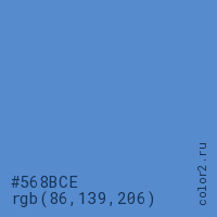 Цвет #568BCE в цветовой модели RGB обозначается тремя октетами (86, 139, 206) в десятичном формате и #568BCE в шестнадцатиричном (hex) формате, которые являются интенсивностью красного 86 (hex 56), интенсивность зелёного 139 (hex 8B) и интенсивность синего 206 (hex CE).