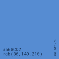 Цвет #568CD2 в цветовой модели RGB обозначается тремя октетами (86, 140, 210) в десятичном формате и #568CD2 в шестнадцатиричном (hex) формате, которые являются интенсивностью красного 86 (hex 56), интенсивность зелёного 140 (hex 8C) и интенсивность синего 210 (hex D2).