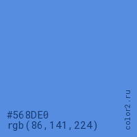 Цвет #568DE0 в цветовой модели RGB обозначается тремя октетами (86, 141, 224) в десятичном формате и #568DE0 в шестнадцатиричном (hex) формате, которые являются интенсивностью красного 86 (hex 56), интенсивность зелёного 141 (hex 8D) и интенсивность синего 224 (hex E0).