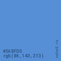 Цвет #568FD5 в цветовой модели RGB обозначается тремя октетами (86, 143, 213) в десятичном формате и #568FD5 в шестнадцатиричном (hex) формате, которые являются интенсивностью красного 86 (hex 56), интенсивность зелёного 143 (hex 8F) и интенсивность синего 213 (hex D5).