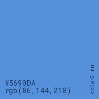 Цвет #5690DA в цветовой модели RGB обозначается тремя октетами (86, 144, 218) в десятичном формате и #5690DA в шестнадцатиричном (hex) формате, которые являются интенсивностью красного 86 (hex 56), интенсивность зелёного 144 (hex 90) и интенсивность синего 218 (hex DA).