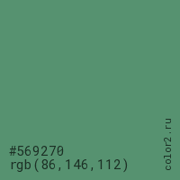 Цвет #569270 в цветовой модели RGB обозначается тремя октетами (86, 146, 112) в десятичном формате и #569270 в шестнадцатиричном (hex) формате, которые являются интенсивностью красного 86 (hex 56), интенсивность зелёного 146 (hex 92) и интенсивность синего 112 (hex 70).
