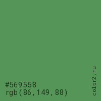 Цвет #569558 в цветовой модели RGB обозначается тремя октетами (86, 149, 88) в десятичном формате и #569558 в шестнадцатиричном (hex) формате, которые являются интенсивностью красного 86 (hex 56), интенсивность зелёного 149 (hex 95) и интенсивность синего 88 (hex 58).