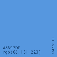 Цвет #5697DF в цветовой модели RGB обозначается тремя октетами (86, 151, 223) в десятичном формате и #5697DF в шестнадцатиричном (hex) формате, которые являются интенсивностью красного 86 (hex 56), интенсивность зелёного 151 (hex 97) и интенсивность синего 223 (hex DF).