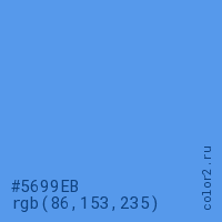 Цвет #5699EB в цветовой модели RGB обозначается тремя октетами (86, 153, 235) в десятичном формате и #5699EB в шестнадцатиричном (hex) формате, которые являются интенсивностью красного 86 (hex 56), интенсивность зелёного 153 (hex 99) и интенсивность синего 235 (hex EB).