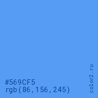 Цвет #569CF5 в цветовой модели RGB обозначается тремя октетами (86, 156, 245) в десятичном формате и #569CF5 в шестнадцатиричном (hex) формате, которые являются интенсивностью красного 86 (hex 56), интенсивность зелёного 156 (hex 9C) и интенсивность синего 245 (hex F5).
