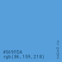 Цвет #569FDA в цветовой модели RGB обозначается тремя октетами (86, 159, 218) в десятичном формате и #569FDA в шестнадцатиричном (hex) формате, которые являются интенсивностью красного 86 (hex 56), интенсивность зелёного 159 (hex 9F) и интенсивность синего 218 (hex DA).