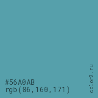 Цвет #56A0AB в цветовой модели RGB обозначается тремя октетами (86, 160, 171) в десятичном формате и #56A0AB в шестнадцатиричном (hex) формате, которые являются интенсивностью красного 86 (hex 56), интенсивность зелёного 160 (hex A0) и интенсивность синего 171 (hex AB).